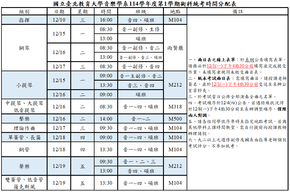 二、紙本考試曲目表:需填寫曲目、請授課老師簽名,並於12/1(一)下午4點30分前交送至系辦公室資料夾。